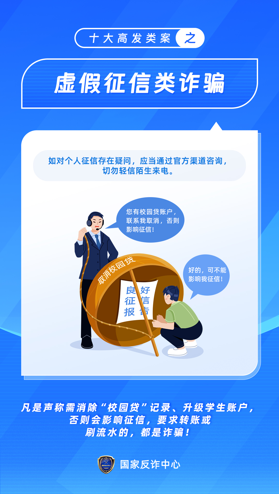 十大高發(fā)類案之虛假征信類詐騙 發(fā)布時間:2023年07月04日 08時52分 作者:管理員 來源:本站 上一條:十大高發(fā)類案之冒充公檢法類詐騙下一條:十大高發(fā)類案之虛假購物、服務(wù)類詐騙