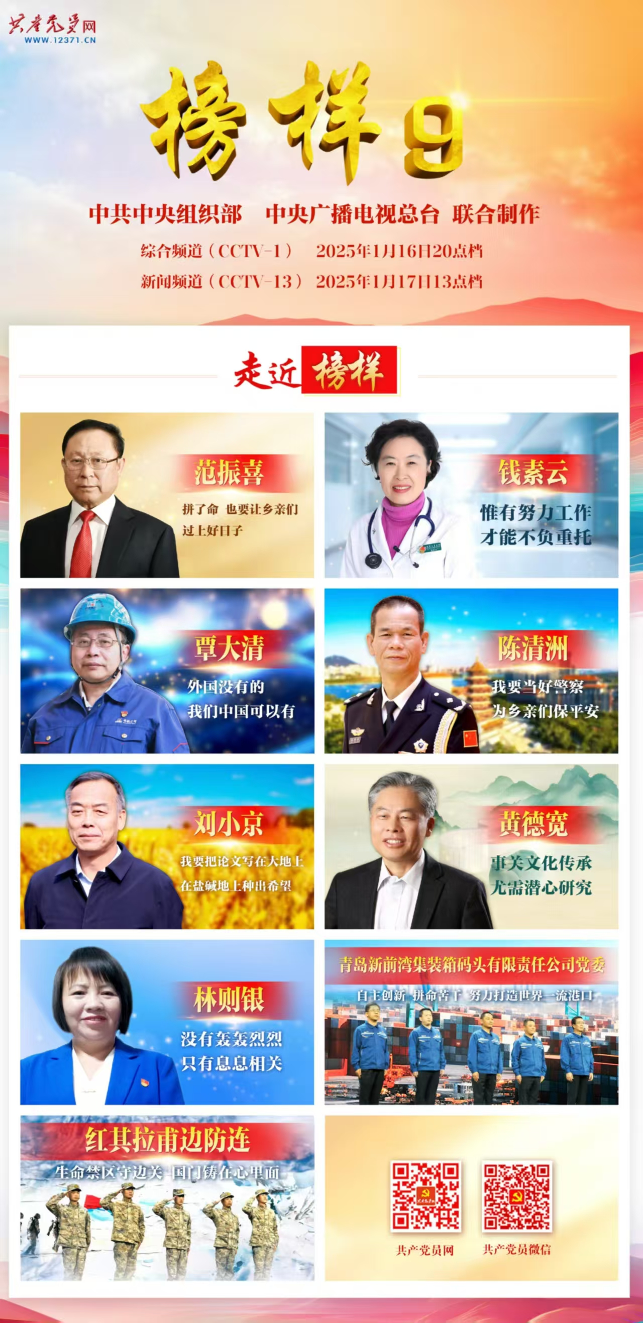 為深入學(xué)習(xí)貫徹習(xí)近平新時(shí)代中國(guó)特色社會(huì)主義思想和黨的二十屆三中全會(huì)精神,教育引導(dǎo)基層黨組織和廣大黨員干部學(xué)習(xí)榜樣、爭(zhēng)當(dāng)先進(jìn),積極投身中國(guó)式現(xiàn)代化建設(shè),中央組織部、中央廣播電視總臺(tái)聯(lián)合制作了《榜樣9》專題節(jié)目。節(jié)目邀請(qǐng)范振喜、錢素云、覃大清、陳清洲、劉小京、黃德寬、林則銀7名黨員和山東青島新前灣集裝箱碼頭公司黨委、陸軍某邊防團(tuán)紅其拉甫邊防連參加錄制,通過典型事跡展示、現(xiàn)場(chǎng)訪談、重溫入黨志愿書等形式,生動(dòng)展現(xiàn)學(xué)習(xí)踐行習(xí)近平新時(shí)代中國(guó)特色社會(huì)主義思想突出事跡,以及堅(jiān)定信念、踐行宗旨、改革創(chuàng)新、擔(dān)當(dāng)作為的高尚品質(zhì)和精神風(fēng)范,彰顯基層黨組織戰(zhàn)斗堡壘作用和黨員先鋒模范作用。